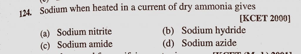 Sodium when heated in a current of dry ammonia gives (a) Sodium nitrate (b) Sodium hydride (c) Sodium amide Sodium when heated in a current of dry ammonia gives (a) Sodium nitrate (b) Sodium hydride (c) Sodium amide November 15, 2020 Category: Uncategorised (JEE Advanced Physics by BM Sharma + GMP Solutions) , Facebook Messenger WhatsApp Share this:TwitterFacebook Related