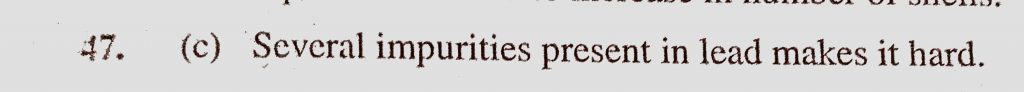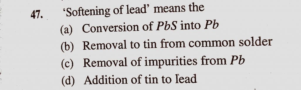 ‘Softening of lead’ means the (a) Conversion of PbS into Pb (b) Removal to tin from common solder (c) Removal of impurities from Pb (d) Addition of tin to lead 'Softening of lead' means the (a) Conversion of PbS into Pb (b) Removal to tin from common solder (c) Removal of impurities from Pb (d) Addition of tin to lead November 17, 2020 Category: Uncategorised (JEE Advanced Physics by BM Sharma + GMP Solutions) , Facebook Messenger WhatsApp Share this:TwitterFacebook Related