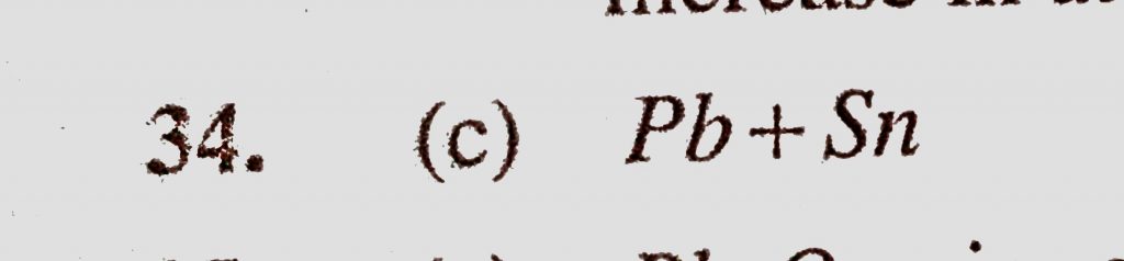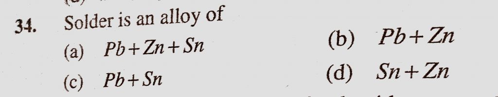Solder is an alloy of (a) Pb + Zn + Sn (b) Pb + Zn (c) Pb + Sn (d) Sn + Zn Solder is an alloy of (a) Pb + Zn + Sn (b) Pb + Zn (c) Pb + Sn (d) Sn + Zn November 17, 2020 Category: Uncategorised (JEE Advanced Physics by BM Sharma + GMP Solutions) , Facebook Messenger WhatsApp Share this:TwitterFacebook Related