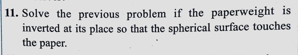 Solve the previous problem if the paperweight is inverted at its place so that the spherical surface touches the paper. Solve the previous problem if the paperweight is inverted at its place so that the spherical surface touches the paper. October 7, 2020 Category: Uncategorised (JEE Advanced Physics by BM Sharma + GMP Solutions) , Facebook Messenger WhatsApp Share this:TwitterFacebook Related