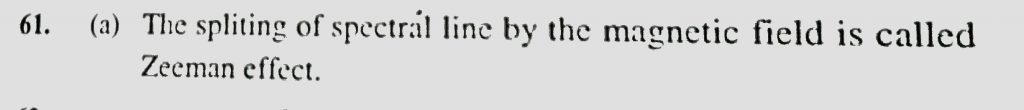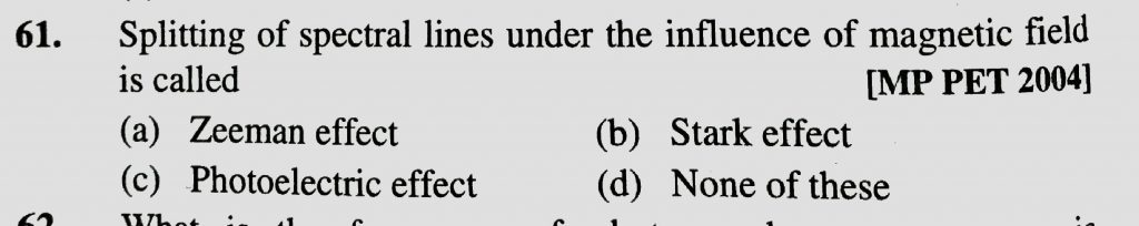 Splitting of spectral lines under the influence of magnetic field is called (a) Zeeman effect (b) stark effect (c) photoelectric effect (d) none of these Splitting of spectral lines under the influence of magnetic field is called (a) Zeeman effect (b) stark effect (c) photoelectric effect (d) none of these November 27, 2020 Category: Uncategorised (JEE Advanced Physics by BM Sharma + GMP Solutions) , Facebook Messenger WhatsApp Share this:TwitterFacebook Related