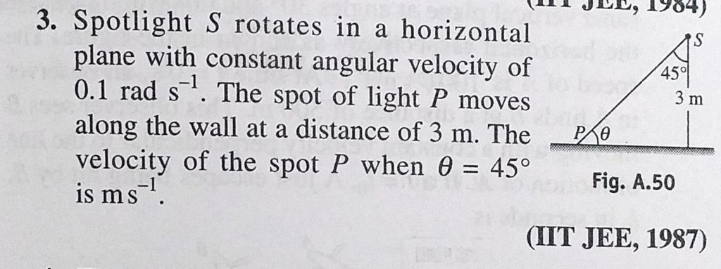 Spotlight S rotates in a horizontal plane with constant angular velocity of 0.1 rad/s. The spot light P moves along the wall at a distance of 3 m. The velocity of the spot P when theta = 45 Spotlight S rotates in a horizontal plane with constant angular velocity of 0.1 rad/s. The spot light P moves along the wall at a distance of 3 m. The velocity of the spot P when theta = 45 September 25, 2020 Category: Uncategorised (JEE Advanced Physics by BM Sharma + GMP Solutions) , Facebook Messenger WhatsApp Share this:TwitterFacebook Related