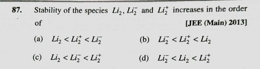 Stability of species Li2 , Li2^- and Li2^+ increases in the order of (a) Li2 < Li2^+ < Li2^- (b) Li2^- < Li2^+ < Li2 (c) Li2 < Li2^- < Li2^+ (d) Li2^- < Li2< Li2^+ Li2^- and Li2^+ increases in the order of (a) Li2 < Li2^+ < Li2^- (b) Li2^- < Li2^+ < Li2 (c) Li2 < Li2^- < Li2^+ (d) Li2^- < Li2< Li2^+ Stability of species Li2 December 15, 2020 Category: Uncategorised (JEE Advanced Physics by BM Sharma + GMP Solutions) , Facebook Messenger WhatsApp Share this:TwitterFacebook Related