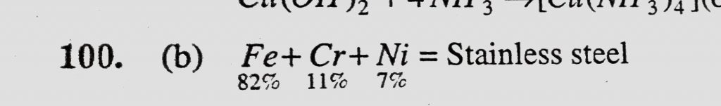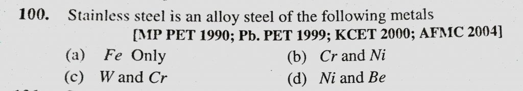 Stainless steel is an alloy steel of the following metals (a) Fe only (b) Cr and Ni (c) W and Cr (d) Ni and Be Stainless steel is an alloy steel of the following metals (a) Fe only (b) Cr and Ni (c) W and Cr (d) Ni and Be December 1, 2020 Category: Uncategorised (JEE Advanced Physics by BM Sharma + GMP Solutions) , Facebook Messenger WhatsApp Share this:TwitterFacebook Related