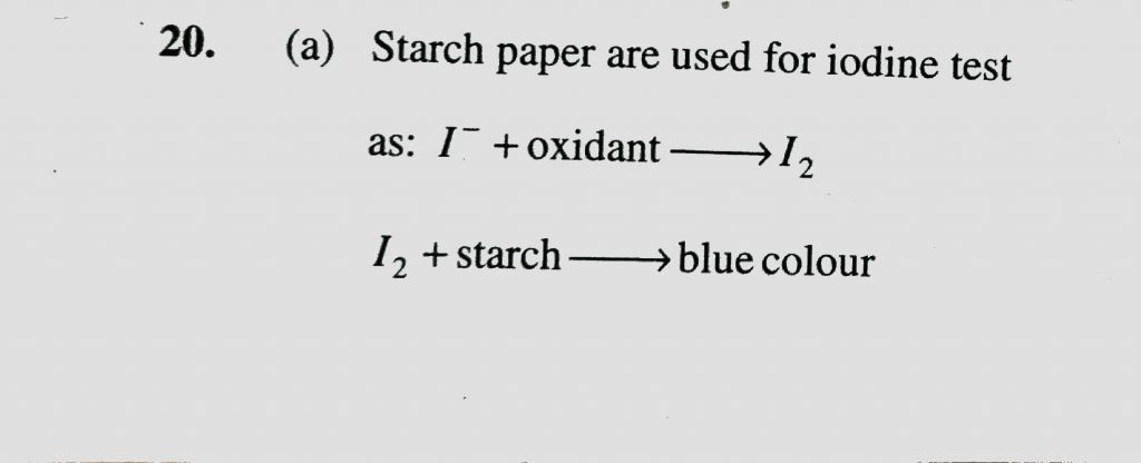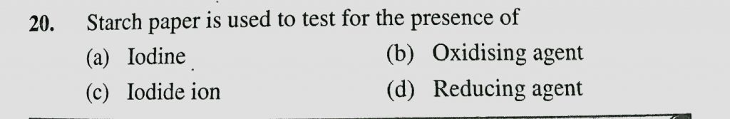 Starch paper is used to test for the presence of (a) Iodine (b) oxidising agent (c) iodine ion (d) reducing agent Starch paper is used to test for the presence of (a) Iodine (b) oxidising agent (c) iodine ion (d) reducing agent November 24, 2020 Category: Uncategorised (JEE Advanced Physics by BM Sharma + GMP Solutions) , Facebook Messenger WhatsApp Share this:TwitterFacebook Related