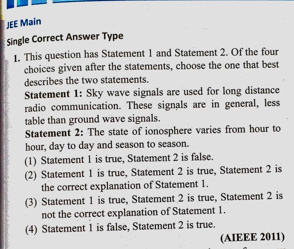 Statement 1: Sky wave signals are used for long distance radio communication. These signals are in general, less table than ground wave signals. Statement 2 : The state of ionosphere less table than ground wave signals. Statement 2 : The state of ionosphere Statement 1: Sky wave signals are used for long distance radio communication. These signals are in general October 23, 2020 Category: Uncategorised (JEE Advanced Physics by BM Sharma + GMP Solutions) , Facebook Messenger WhatsApp Share this:TwitterFacebook Related