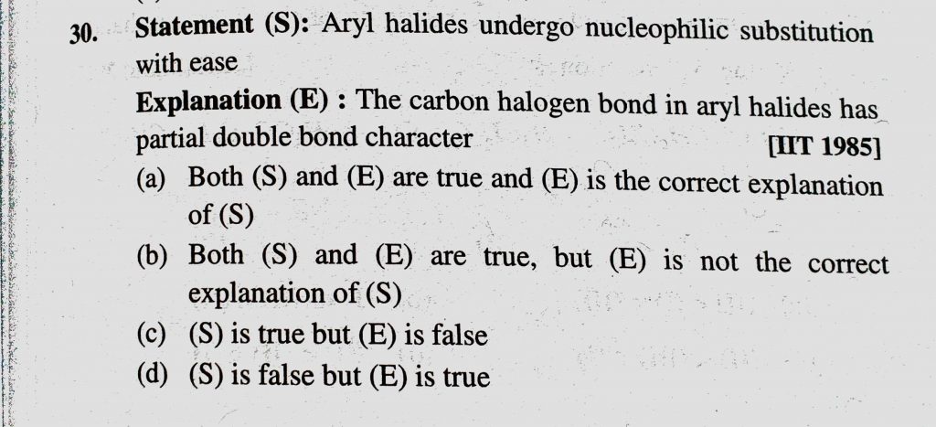Statement (S) : Aryl halides undergo nucleophilic substitution with ease Explanation (E) : The carbon halogen bond in aryl halides has partial double bond character Statement (S) : Aryl halides undergo nucleophilic substitution with ease Explanation (E) : The carbon halogen bond in aryl halides has partial double bond character February 9, 2021 Category: Uncategorised (JEE Advanced Physics by BM Sharma + GMP Solutions) , Facebook Messenger WhatsApp Share this:TwitterFacebook Related
