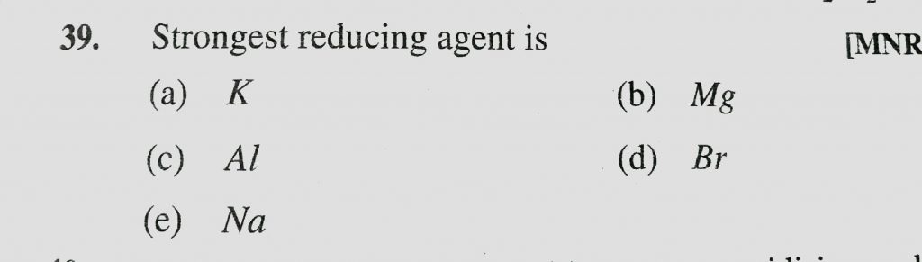 Strongest reducing agent is (a) K (b) Mg (c) Al (d) Br (e) Na Strongest reducing agent is (a) K (b) Mg (c) Al (d) Br (e) Na November 23, 2020 Category: Uncategorised (JEE Advanced Physics by BM Sharma + GMP Solutions) , Facebook Messenger WhatsApp Share this:TwitterFacebook Related