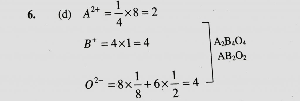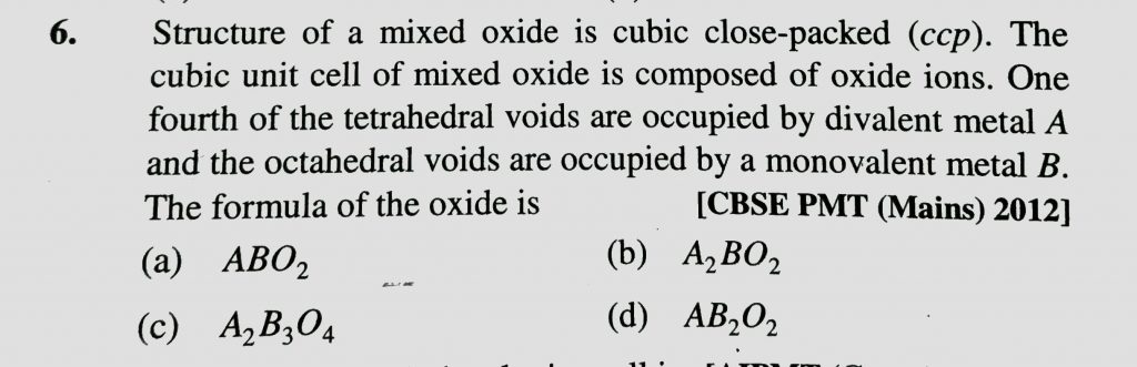 Structure of a mixed oxide is cubic close packed ( ccp ). The cubic unit cell of mixed oxide is composed of oxide ions. One fourth of the tetrahedral voids are occupied by divalent metal A and the octahedral voids are occupied by a monovalent metal B. The formula of the oxide is