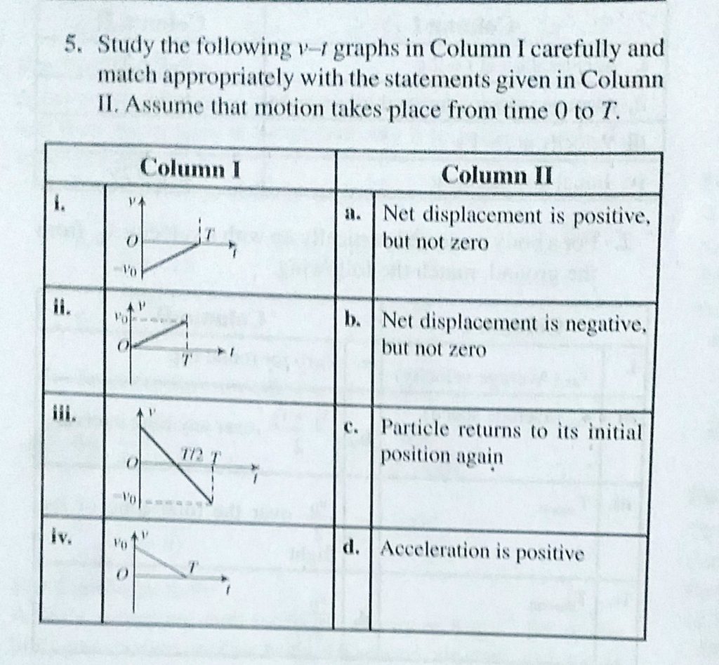 Study the following v-t graphs in Column 1 carefully and match appropriately with the statements given in Column 2. Assume that motion takes place from time 0 to T. Study the following v-t graphs in Column 1 carefully and match appropriately with the statements given in Column 2. Assume that motion takes place from time 0 to T. September 19, 2020 Category: Uncategorised (JEE Advanced Physics by BM Sharma + GMP Solutions) , Facebook Messenger WhatsApp Share this:TwitterFacebook Related