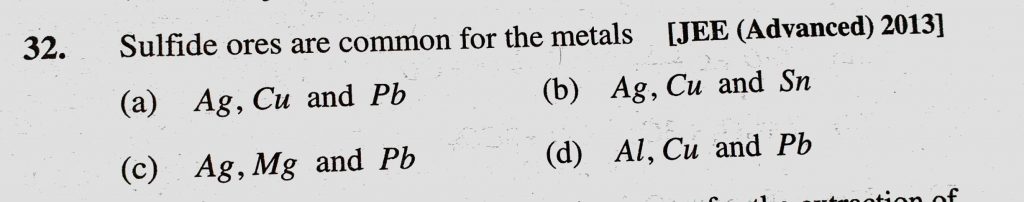 Sulphide ores are common for the metals (a) Ag, Cu and Pb (b) Ag, Cu and Sn Cu and Pb (b) Ag Cu and Sn Sulphide ores are common for the metals (a) Ag November 12, 2020 Category: Uncategorised (JEE Advanced Physics by BM Sharma + GMP Solutions) , Facebook Messenger WhatsApp Share this:TwitterFacebook Related