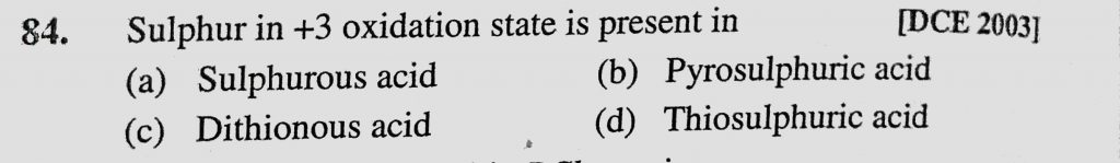 Sulphur in +3 oxidation state is present in (a) Sulphurous acid (b) Pyrosulphuric acid (c) Dithionous acid (d) Thiosulphuric acid Sulphur in +3 oxidation state is present in (a) Sulphurous acid (b) Pyrosulphuric acid (c) Dithionous acid (d) Thiosulphuric acid November 23, 2020 Category: Uncategorised (JEE Advanced Physics by BM Sharma + GMP Solutions) , Facebook Messenger WhatsApp Share this:TwitterFacebook Related