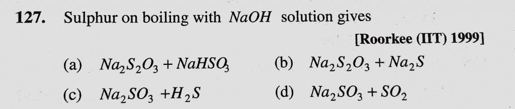 Sulphur on boiling with NaOH solution gives (a) Na2S2O3 + NaHSO3 (b) Na2S2O3 + Na2S Sulphur on boiling with NaOH solution gives (a) Na2S2O3 + NaHSO3 (b) Na2S2O3 + Na2S November 27, 2020 Category: Uncategorised (JEE Advanced Physics by BM Sharma + GMP Solutions) , Facebook Messenger WhatsApp Share this:TwitterFacebook Related