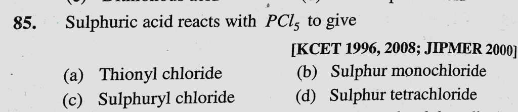 Sulphuric acid reacts with PCl5 to give (a) Thionyl chloride (b) Sulphur monochloride (c) Sulphuryl chloride Sulphuric acid reacts with PCl5 to give (a) Thionyl chloride (b) Sulphur monochloride (c) Sulphuryl chloride November 23, 2020 Category: Uncategorised (JEE Advanced Physics by BM Sharma + GMP Solutions) , Facebook Messenger WhatsApp Share this:TwitterFacebook Related