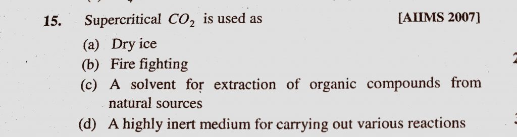 Supercritical CO2 is used as (a) Dry ice (b) Fire fighting (c) A solvent for extraction of organic compounds from natural sources Supercritical CO2 is used as (a) Dry ice (b) Fire fighting (c) A solvent for extraction of organic compounds from natural sources November 17, 2020 Category: Uncategorised (JEE Advanced Physics by BM Sharma + GMP Solutions) , Facebook Messenger WhatsApp Share this:TwitterFacebook Related