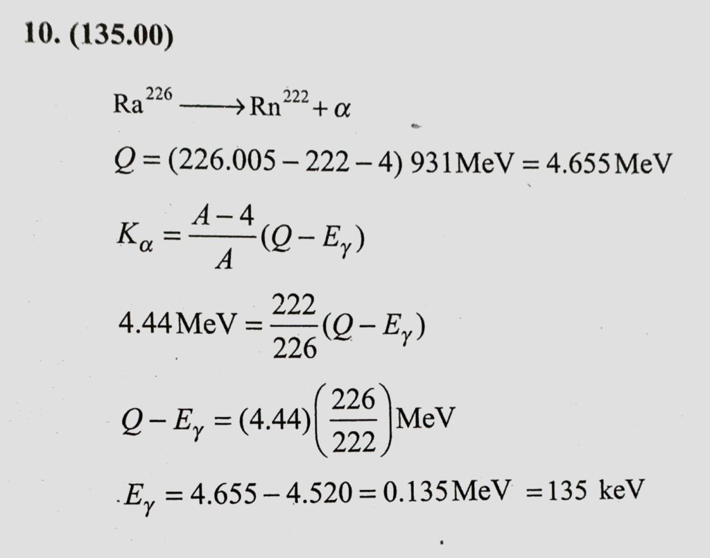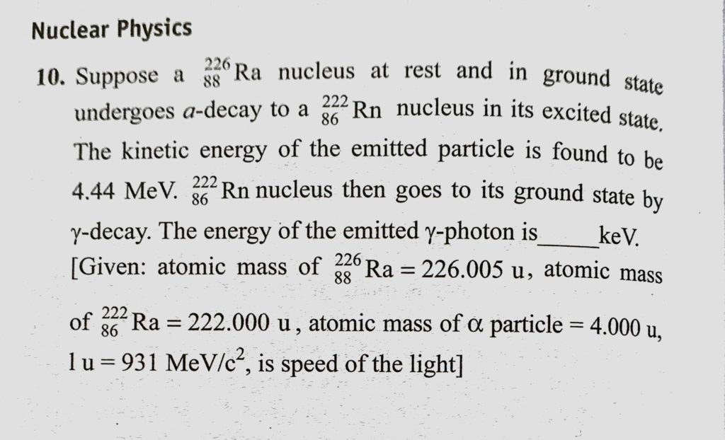 Suppose a 226Ra88 nucleus at rest and in ground state undergoes a-decay to a 222Rn86 nucleus in its excited state. The kinetic energy of the emitted particle is found to be 4,44 MeV. 44 MeV. Suppose a 226Ra88 nucleus at rest and in ground state undergoes a-decay to a 222Rn86 nucleus in its excited state. The kinetic energy of the emitted particle is found to be 4 October 23, 2020 Category: Uncategorised (JEE Advanced Physics by BM Sharma + GMP Solutions) , Facebook Messenger WhatsApp Share this:TwitterFacebook Related