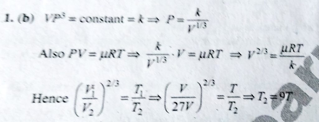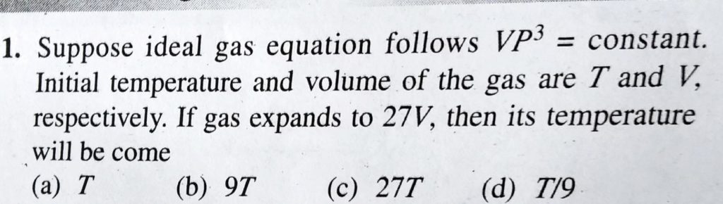 Suppose ideal gas equation follows VP^3 = constant . Initial temperature and volume of the gas are T and V, respectively. If gas expands to 27 V, then its tyemperature will be come respectively. If gas expands to 27 V Suppose ideal gas equation follows VP^3 = constant . Initial temperature and volume of the gas are T and V then its tyemperature will be come October 4, 2020 Category: Uncategorised (JEE Advanced Physics by BM Sharma + GMP Solutions) , Facebook Messenger WhatsApp Share this:TwitterFacebook Related