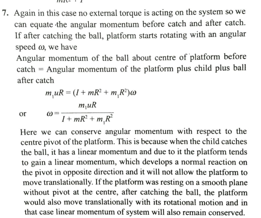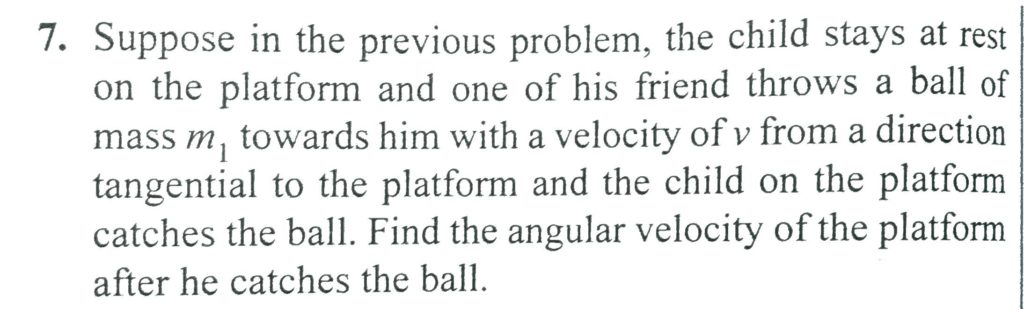 Suppose in the previous poroblem, the child stays at rest on the platform and one of hils firend throws a ball of mas m1 towards thim with a velocity of v from a direction tangential to the platform and the child on the platform catches the ball. Find the angular velocity of the platform after he catches the ball.