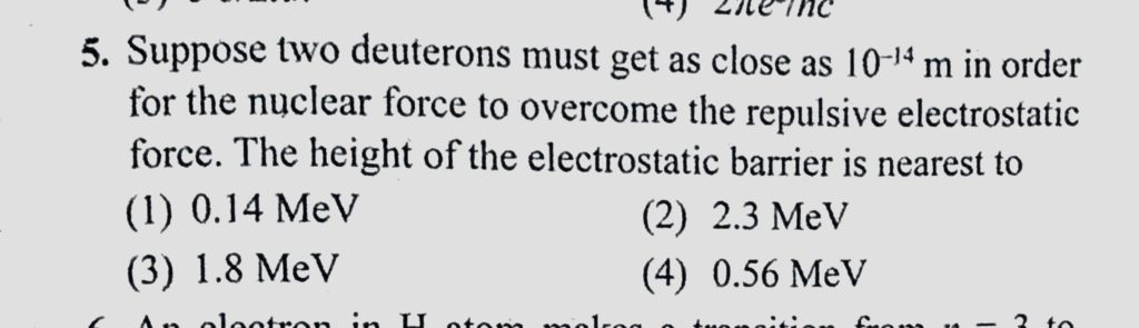 Suppose two deuterons must get as close as 10^-14 m in order for the nuclear force to overcome the repulsive electrostatic force. The height of the electrostatic barrier is nearest to Suppose two deuterons must get as close as 10^-14 m in order for the nuclear force to overcome the repulsive electrostatic force. The height of the electrostatic barrier is nearest to October 15, 2020 Category: Uncategorised (JEE Advanced Physics by BM Sharma + GMP Solutions) , Facebook Messenger WhatsApp Share this:TwitterFacebook Related