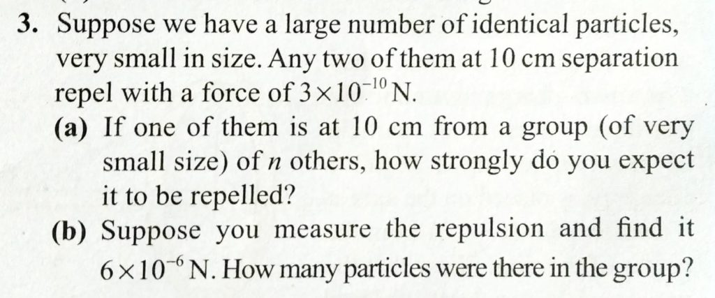Suppose we have large number of identical particles, very small in size. Any of them at 10 cm separation repel with a force of 3 × 10^−10 N. If one of them is at 10 cm from a group of n others, how strongly do you expect it to be repelled? how strongly do you expect it to be repelled? Suppose we have large number of identical particles very small in size. Any of them at 10 cm separation repel with a force of 3 × 10^−10 N. If one of them is at 10 cm from a group of n others October 28, 2020 Category: Uncategorised (JEE Advanced Physics by BM Sharma + GMP Solutions) , Facebook Messenger WhatsApp Share this:TwitterFacebook Related