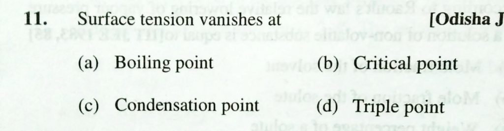 Surface tension vanishes at (a) Boiling point (b) Critical point (c) Condensation point (d) Triple point Surface tension vanishes at (a) Boiling point (b) Critical point (c) Condensation point (d) Triple point December 14, 2020 Category: Uncategorised (JEE Advanced Physics by BM Sharma + GMP Solutions) , Facebook Messenger WhatsApp Share this:TwitterFacebook Related