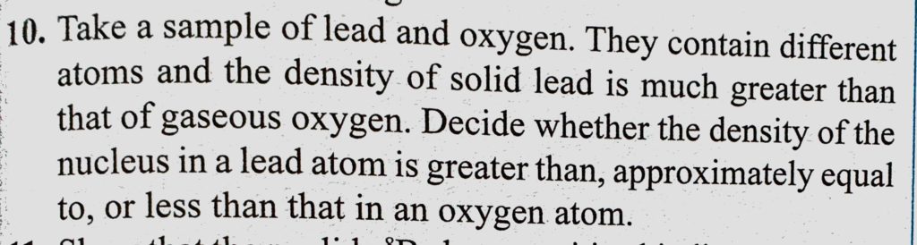 Take a sample of lead and oxygen. They contain different atoms and the density of solid lead is much greater than that of gaseous oxygen. Decide whether the density of the nucleus in a lead atom Take a sample of lead and oxygen. They contain different atoms and the density of solid lead is much greater than that of gaseous oxygen. Decide whether the density of the nucleus in a lead atom October 17, 2020 Category: Uncategorised (JEE Advanced Physics by BM Sharma + GMP Solutions) , Facebook Messenger WhatsApp Share this:TwitterFacebook Related