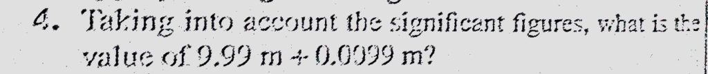 Taking into account the significant figures, what is the value of 9.99 m + 0.0099 m? Taking into account the significant figures what is the value of 9.99 m + 0.0099 m? September 14, 2020 Category: Uncategorised (JEE Advanced Physics by BM Sharma + GMP Solutions) , Facebook Messenger WhatsApp Share this:TwitterFacebook Related