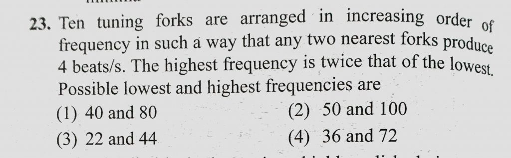 Ten tuning forks are arranged in increasing order of frequency in such a way that any two nearest forks produce 4 beats/s. The highest frequency is twice that of the lowest. Possible Ten tuning forks are arranged in increasing order of frequency in such a way that any two nearest forks produce 4 beats/s. The highest frequency is twice that of the lowest. Possible November 6, 2020 Category: Uncategorised (JEE Advanced Physics by BM Sharma + GMP Solutions) , Facebook Messenger WhatsApp Share this:TwitterFacebook Related