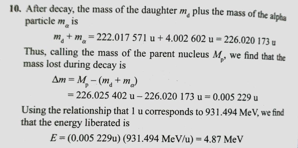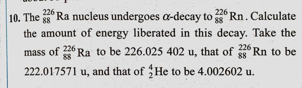 The 226Ra88 nucleus undergoes alpha decay to 226Rn88. Calculate the amount of energy liberated in this decay. Take the mass of 226Ra88 to be 226.025 402 u, that of 226Rn88 to be 222.017571 u, that of 226Rn88 to be 222.017571 u The 226Ra88 nucleus undergoes alpha decay to 226Rn88. Calculate the amount of energy liberated in this decay. Take the mass of 226Ra88 to be 226.025 402 u October 17, 2020 Category: Uncategorised (JEE Advanced Physics by BM Sharma + GMP Solutions) , Facebook Messenger WhatsApp Share this:TwitterFacebook Related