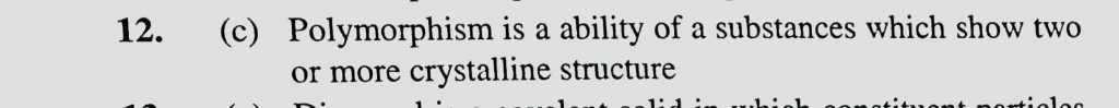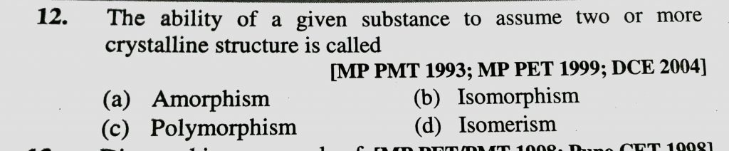 The ability of a given substance to assume two or more crystalline structure is called (a) Amorphism (b) Isomorphism (c) Polymorphism (d) Isomerism The ability of a given substance to assume two or more crystalline structure is called (a) Amorphism (b) Isomorphism (c) Polymorphism (d) Isomerism February 8, 2021 Category: Uncategorised (JEE Advanced Physics by BM Sharma + GMP Solutions) , Facebook Messenger WhatsApp Share this:TwitterFacebook Related