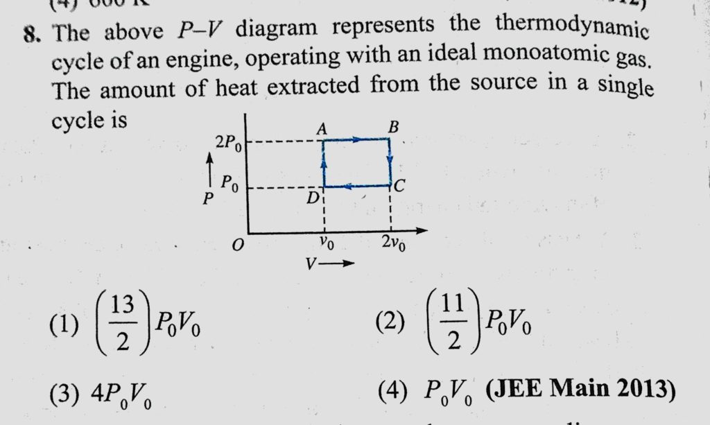 The above P-V diagram represents the thermodynamic cycle of an engine, operating with an ideal monoatomic gas. The amount of heat extracted from the source in a single cycle is operating with an ideal monoatomic gas. The amount of heat extracted from the source in a single cycle is The above P-V diagram represents the thermodynamic cycle of an engine October 29, 2020 Category: Uncategorised (JEE Advanced Physics by BM Sharma + GMP Solutions) , Facebook Messenger WhatsApp Share this:TwitterFacebook Related