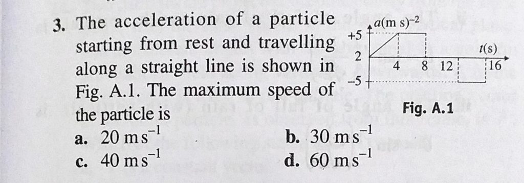 The acceleration of a particle starting from rest and travelling along a straight line is shown in Fig. A.1. The maximum speed of the particle is The acceleration of a particle starting from rest and travelling along a straight line is shown in Fig. A.1. The maximum speed of the particle is September 24, 2020 Category: Uncategorised (JEE Advanced Physics by BM Sharma + GMP Solutions) , Facebook Messenger WhatsApp Share this:TwitterFacebook Related