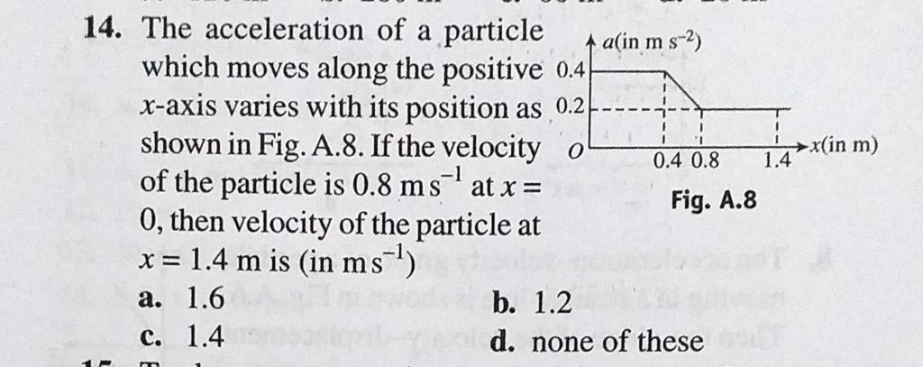 The acceleration of a particle which moves along the positive x-axis varies with its position as shown in Fig. A. 8. If the velocity of the particle is 0.8 m/s at x =0, then velocity of the particle at x = 1.4 m is The acceleration of a particle which moves along the positive x-axis varies with its position as shown in Fig. A. 8. If the velocity of the particle is 0.8 m/s at x =0 then velocity of the particle at x = 1.4 m is September 24, 2020 Category: Uncategorised (JEE Advanced Physics by BM Sharma + GMP Solutions) , Facebook Messenger WhatsApp Share this:TwitterFacebook Related