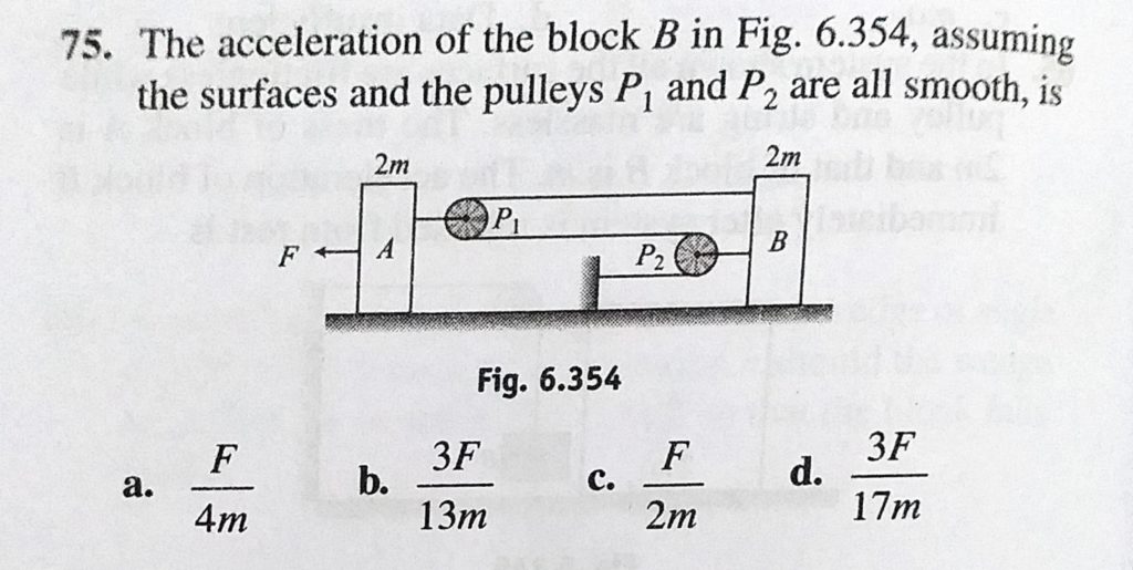 The acceleration of the block B in Fig. 6.354, assuming the surfaces and the pulleys P1 and P2 are all smooth is assuming the surfaces and the pulleys P1 and P2 are all smooth is The acceleration of the block B in Fig. 6.354 September 29, 2020 Category: Uncategorised (JEE Advanced Physics by BM Sharma + GMP Solutions) , Facebook Messenger WhatsApp Share this:TwitterFacebook Related
