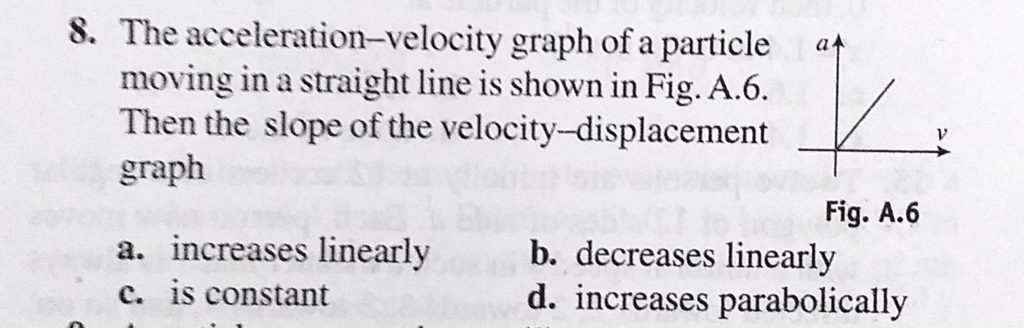 The acceleration – velocity graph of a particle moving in a straight line is shown in Fig. A.6. Then the slope of the velocity – displacement graph The acceleration - velocity graph of a particle moving in a straight line is shown in Fig. A.6. Then the slope of the velocity - displacement graph September 24, 2020 Category: Uncategorised (JEE Advanced Physics by BM Sharma + GMP Solutions) , Facebook Messenger WhatsApp Share this:TwitterFacebook Related