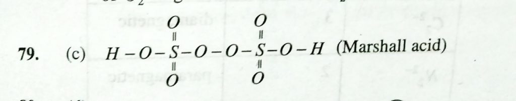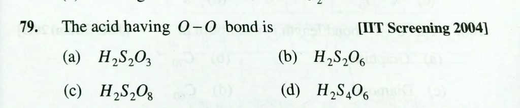 The acid having O- O bond is (a) H2S2O3 (b) H2S2O6 (c) H2S2O8 (d) H2S4O6 The acid having O-O bond is (a) H2S2O3 (b) H2S2O6 (c) H2S2O8 (d) H2S4O6 December 10, 2020 Category: Uncategorised (JEE Advanced Physics by BM Sharma + GMP Solutions) , Facebook Messenger WhatsApp Share this:TwitterFacebook Related