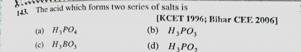 The acid which forms two series of salts is (a) H3PO4 (b) H3PO3 (c) H3BO3 (d) H3PO2 The acid which forms two series of salts is (a) H3PO4 (b) H3PO3 (c) H3BO3 (d) H3PO2 November 23, 2020 Category: Uncategorised (JEE Advanced Physics by BM Sharma + GMP Solutions) , Facebook Messenger WhatsApp Share this:TwitterFacebook Related