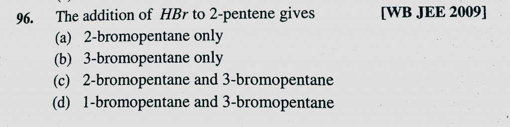 The addition of HBr to 2-pentene gives (a) 2-bromopentane only (b) 3-bromopentane only (c) 2-bromopentane and 3-bromopentane (d) 1-bromopentane and 3-bromopentane The addition of HBr to 2-pentene gives (a) 2-bromopentane only (b) 3-bromopentane only (c) 2-bromopentane and 3-bromopentane (d) 1-bromopentane and 3-bromopentane December 13, 2020 Category: Uncategorised (JEE Advanced Physics by BM Sharma + GMP Solutions) , Facebook Messenger WhatsApp Share this:TwitterFacebook Related
