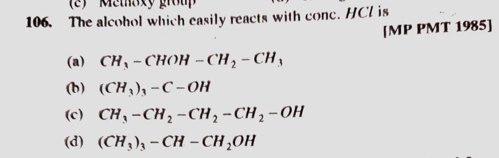 The alcohol which easily reacts with conc. HCl is (a) CH3 -CHOH -CH2 -CH3 (b) (CH3)3 – C – OH (c) CH3 – CH2 -CH2 -CH2 -OH The alcohol which easily reacts with conc. HCl is (a) CH3 -CHOH -CH2 -CH3 (b) (CH3)3 - C - OH (c) CH3 - CH2 -CH2 -CH2 -OH February 13, 2021 Category: Uncategorised (JEE Advanced Physics by BM Sharma + GMP Solutions) , Facebook Messenger WhatsApp Share this:TwitterFacebook Related