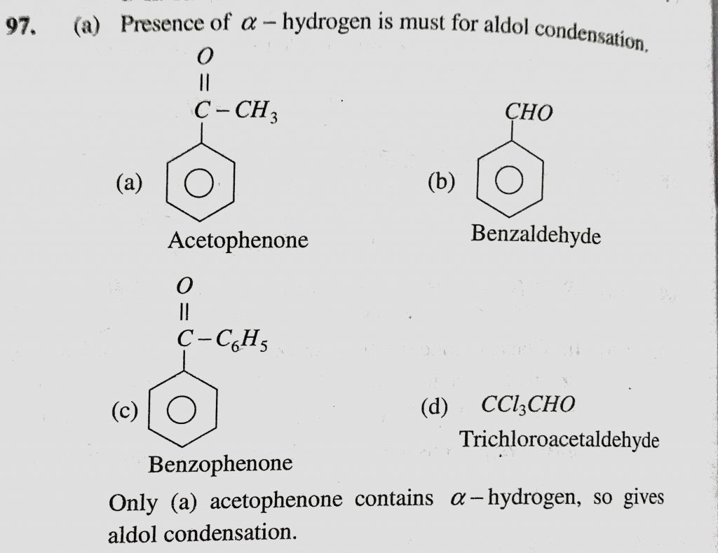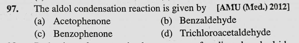 The aldol condensation reaction is given by (a) Acetophenone (b) Benzaldehyde (c) Benzophenone (d) Trichloroacetaldehyde The aldol condensation reaction is given by (a) Acetophenone (b) Benzaldehyde (c) Benzophenone (d) Trichloroacetaldehyde February 12, 2021 Category: Uncategorised (JEE Advanced Physics by BM Sharma + GMP Solutions) , Facebook Messenger WhatsApp Share this:TwitterFacebook Related