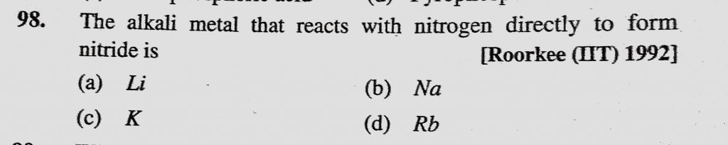 The alkali metal that reacts with nitrogen directly to form nitride is (a) Li (b) Na (c) K (d) Rb The alkali metal that reacts with nitrogen directly to form nitride is (a) Li (b) Na (c) K (d) Rb November 27, 2020 Category: Uncategorised (JEE Advanced Physics by BM Sharma + GMP Solutions) , Facebook Messenger WhatsApp Share this:TwitterFacebook Related