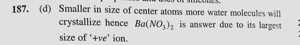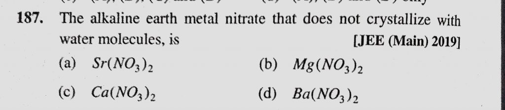 The alkaline earth metal nitrate that does not crystallize with water molecules, is (a) Sr(NO3)2 (b) Mg(NO3)2 (c) Ca(NO3)2 (d) Ba(NO)3)2 is (a) Sr(NO3)2 (b) Mg(NO3)2 (c) Ca(NO3)2 (d) Ba(NO)3)2 The alkaline earth metal nitrate that does not crystallize with water molecules November 28, 2020 Category: Uncategorised (JEE Advanced Physics by BM Sharma + GMP Solutions) , Facebook Messenger WhatsApp Share this:TwitterFacebook Related