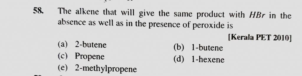 The alkene that will give the same product with HBr in the absence as well as in the presence of peroxide is (a) 2-butene (b) 1-butene (c) Propene (d) 1-hexene The alkene that will give the same product with HBr in the absence as well as in the presence of peroxide is (a) 2-butene (b) 1-butene (c) Propene (d) 1-hexene December 13, 2020 Category: Uncategorised (JEE Advanced Physics by BM Sharma + GMP Solutions) , Facebook Messenger WhatsApp Share this:TwitterFacebook Related