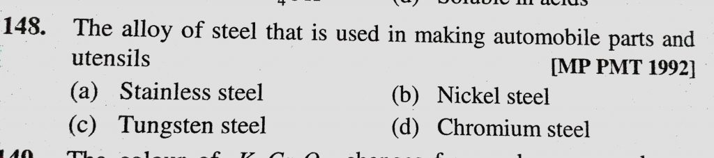 The alloy of steel that is used in making automobile parts and utensils (a) Stainless steel (b) Nickel steel (c) Tungsten steel The alloy of steel that is used in making automobile parts and utensils (a) Stainless steel (b) Nickel steel (c) Tungsten steel December 1, 2020 Category: Uncategorised (JEE Advanced Physics by BM Sharma + GMP Solutions) , Facebook Messenger WhatsApp Share this:TwitterFacebook Related