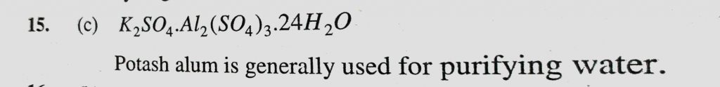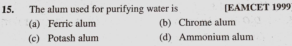The alum used for purifying water is (a) Ferric alum (b) Chrome alum (c) Potash alum (d) Ammonium alum The alum used for purifying water is (a) Ferric alum (b) Chrome alum (c) Potash alum (d) Ammonium alum November 13, 2020 Category: Uncategorised (JEE Advanced Physics by BM Sharma + GMP Solutions) , Facebook Messenger WhatsApp Share this:TwitterFacebook Related