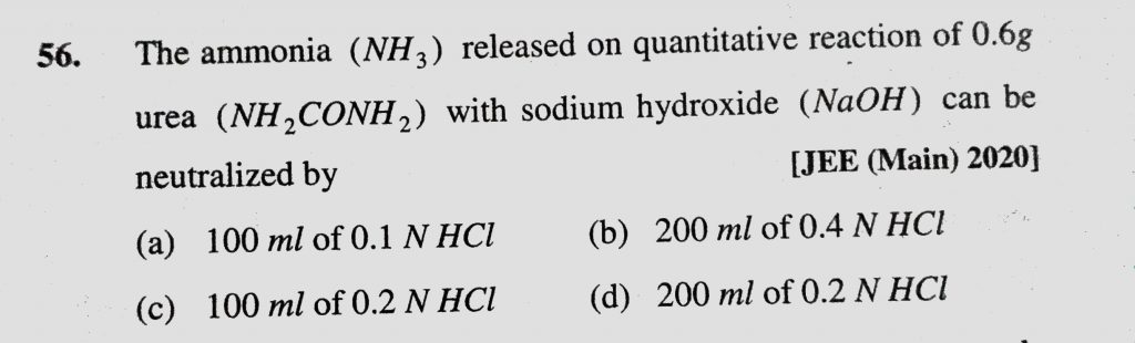 The ammonia (NH3) released on quantitative reaction of 0.6 g urea (NH2CONH2) with sodium hydroxide (NaOH) can be neutralized by The ammonia (NH3) released on quantitative reaction of 0.6 g urea (NH2CONH2) with sodium hydroxide (NaOH) can be neutralized by December 8, 2020 Category: Uncategorised (JEE Advanced Physics by BM Sharma + GMP Solutions) , Facebook Messenger WhatsApp Share this:TwitterFacebook Related