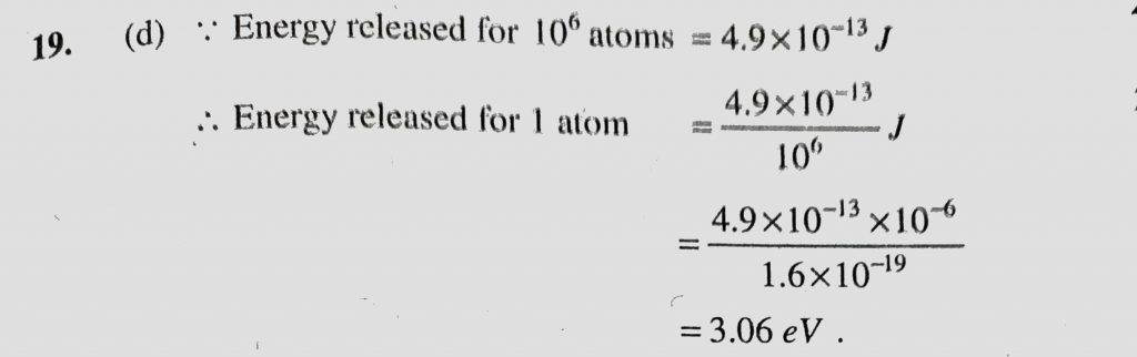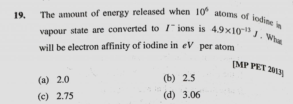 The amount of energy released when 10^6 atoms of iodine in vapour state are converted to I- ions is 4.9 * 10^13 J. What will be electron affinity of iodine in eV per atom The amount of energy released when 10^6 atoms of iodine in vapour state are converted to I- ions is 4.9 * 10^13 J. What will be electron affinity of iodine in eV per atom November 10, 2020 Category: Uncategorised (JEE Advanced Physics by BM Sharma + GMP Solutions) , Facebook Messenger WhatsApp Share this:TwitterFacebook Related