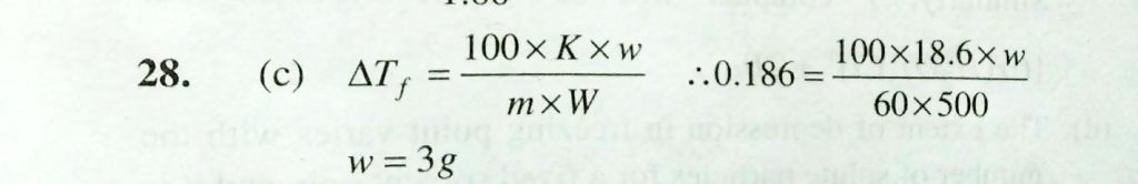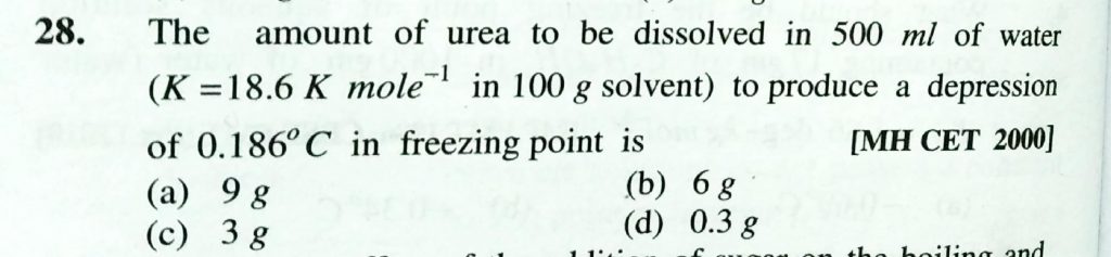 The amount of urea to be dissolved in 500 ml of water ( K = 18.6 K / mole in 100 g solvent ) to produce a depression of 0.186 degree C in freeezing point is The amount of urea to be dissolved in 500 ml of water ( K = 18.6 K / mole in 100 g solvent ) to produce a depression of 0.186 degree C in freeezing point is December 14, 2020 Category: Uncategorised (JEE Advanced Physics by BM Sharma + GMP Solutions) , Facebook Messenger WhatsApp Share this:TwitterFacebook Related