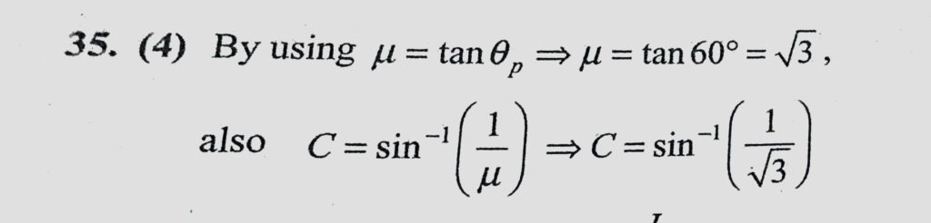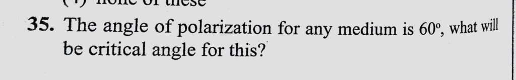 The angle of polarization for any medium is 60, what will be critical angle for this? The angle of polarization for any medium is 60 what will be critical angle for this? October 12, 2020 Category: Uncategorised (JEE Advanced Physics by BM Sharma + GMP Solutions) , Facebook Messenger WhatsApp Share this:TwitterFacebook Related