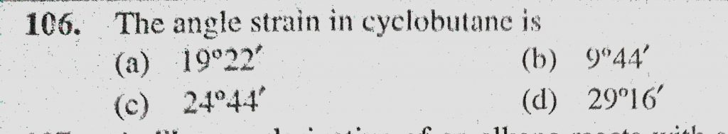 The angle strain in cyclobutane is (a) 19 degree 22′ (b) 9 degree 44′ (c) 24 degree 44′ (d) 29 degree 16′ The angle strain in cyclobutane is (a) 19 degree 22' (b) 9 degree 44' (c) 24 degree 44' (d) 29 degree 16' December 13, 2020 Category: Uncategorised (JEE Advanced Physics by BM Sharma + GMP Solutions) , Facebook Messenger WhatsApp Share this:TwitterFacebook Related